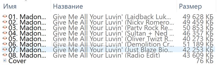 ![]() Название: Give Me All Your Luvin' (feat. Nicki Minaj & M.I.A.) (Remixes) Исполнитель: Madonna, Nicki Minaj, M.I.A. Год: 2012/2026 Жанр: Electronic Стиль: House, Electro House, Big Beat Издатель (лейбл): Warner Records Продолжительность: 00:42:54 Формат/Кодек: FLAC Тип рипа: Tracks Битрейт аудио: Lossless Разрядность: 24 Bit/44,1 kHz Трек-лист DRM Время раздачи: 24/7 (минимум до появления первых 3-5 скачавших, на раздачи не возвращаюсь) Первое правило участника файлообмена: "Скачал сам - дай скачать другому!" ![]() ![]() | |